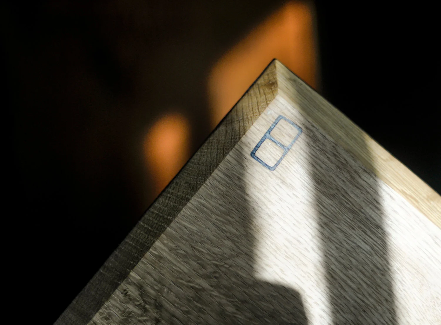 The chamfer on the underside is designed to make it easier to pick up the board. The blackened effect on the edge of the board and the inside of the recess is achieved by scorching the timber.